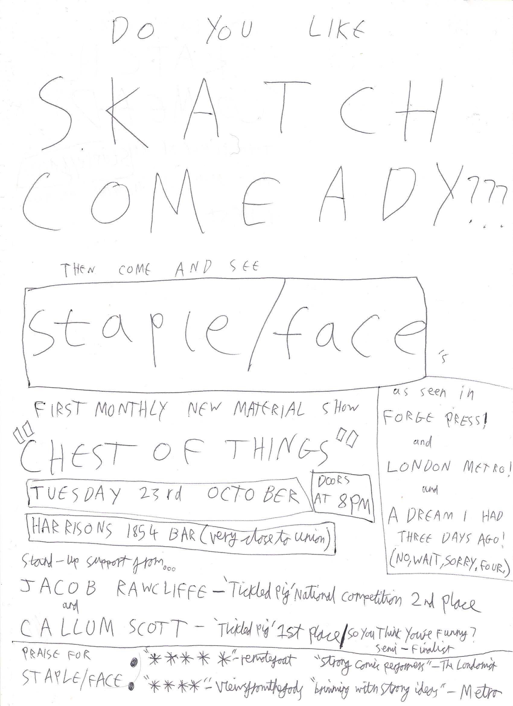 From 2012-2014 I was in sketch-comedy disaster Staple/face. As I consider this to be in the distant past I have presented this era as a potted history for the interests of total creeps only.