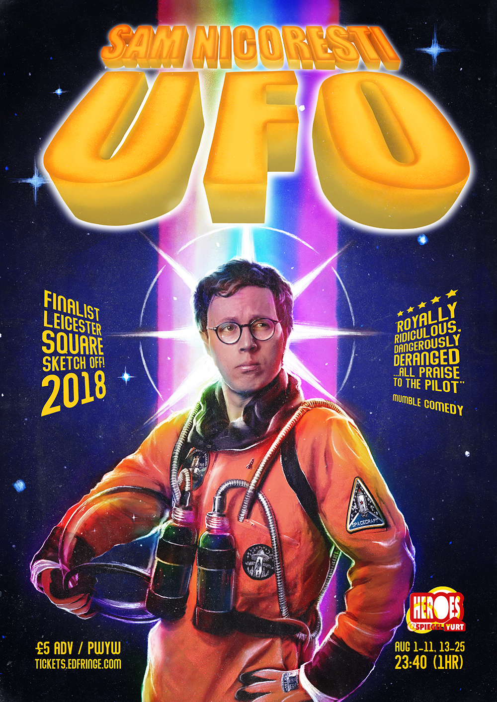 Space travelling ping-pong balls, water bottle astronaut suits and smuggled voice recordings of a drug dealer's holiday plans; you are unlikely to forget Sam Nicoresti's debut show UFO in a hurry.